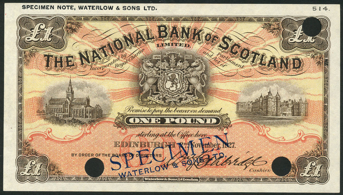 (x) National Bank of Scotland Limited, colour trial £1, 2 November 1927, no serial number, brown on red and yellow sunburst underprint, bank arms at centre, Palace of Holyroodhouse at right and Glasgow Cathedral at left, Lethbridge signature, reverse, red, view of Edinburgh in red guilloche pattern