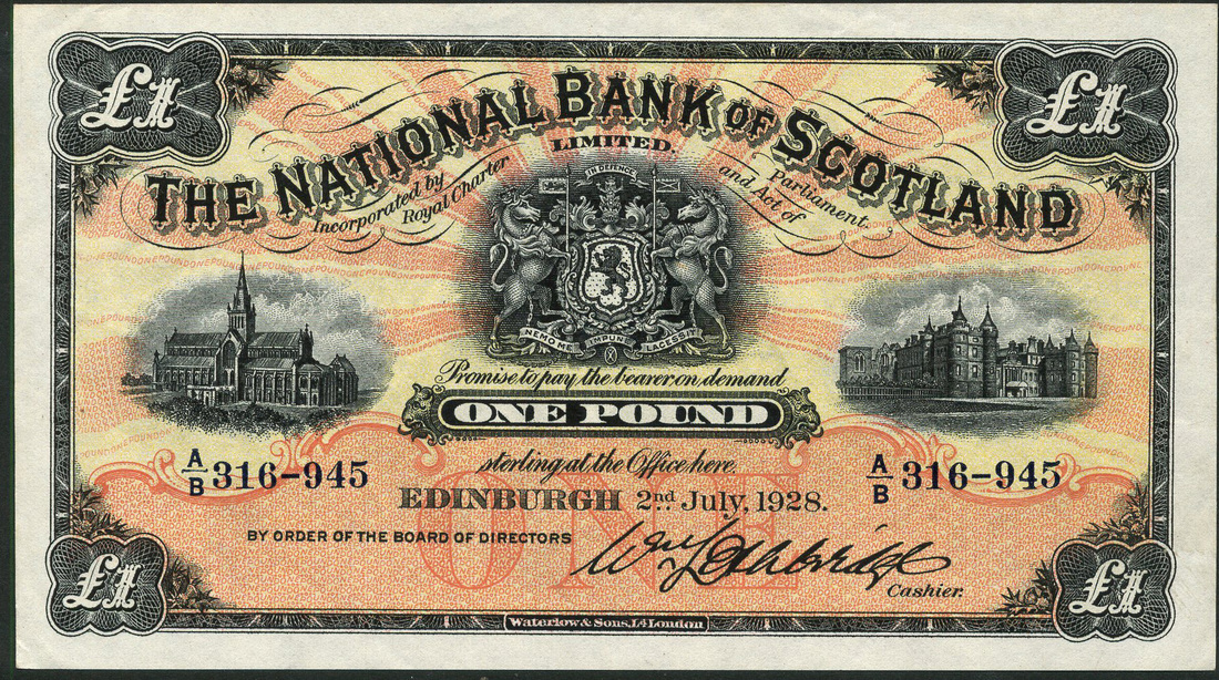 (x) National Bank of Scotland, £1, 2 July 1928, serial number A/B316-945, dark grey on red and yellow sunburst underprint, royal coat of arms at centre, Glasgow Cathedral at left and Palace of Holyroodhouse at right, Lethbridge signature, reverse, aerial view of Edinburgh in circular frame flanked by value within ornate guilloche