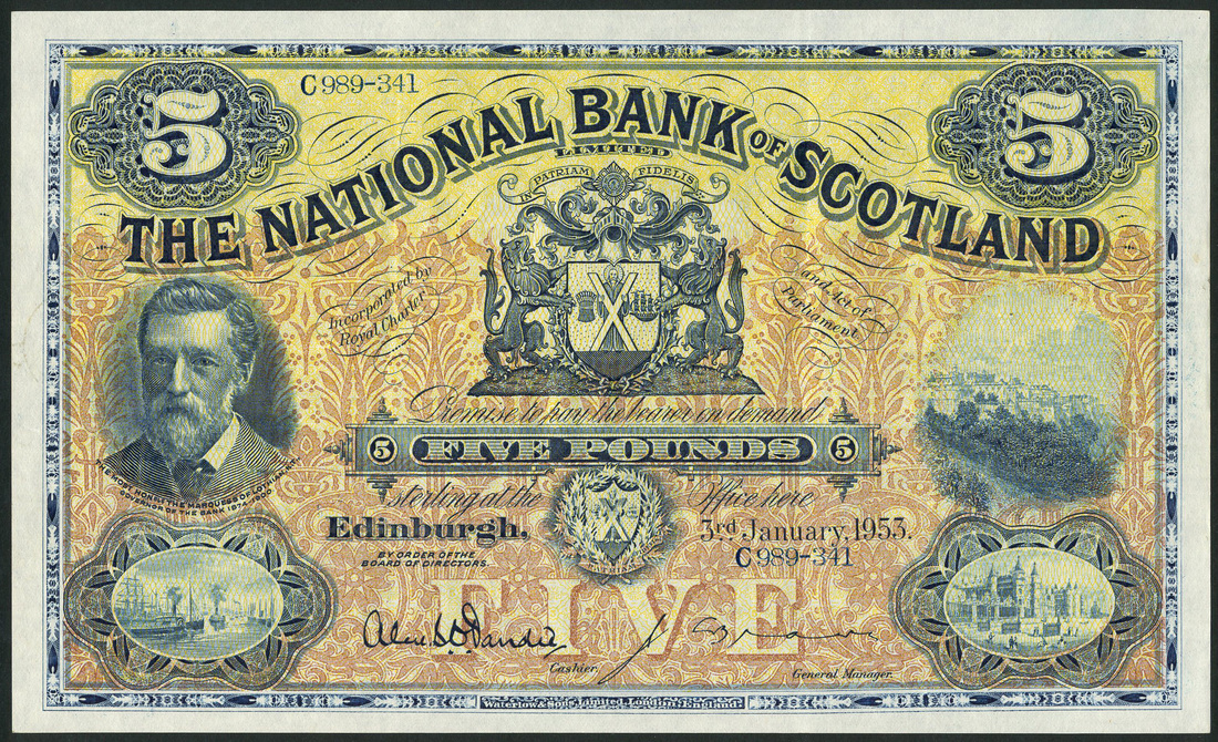 (x) National Bank of Scotland Limited, £5, 3 January 1953, serial number C989-341, blue on yellow and tan underprint, portrait Marquess of Lothian at left, royal coat of arms at centre, Edinburgh Castle at right, Dandie and Brown signatures, reverse, aerial view of Edinburgh in circular panel within ornate pattern, value in each corner