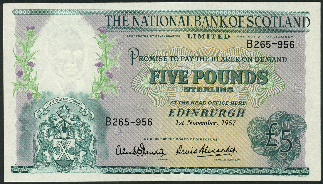 (x) National Bank of Scotland, £5, 1 November 1957, serial number B265-956, green on multicolour underprint, bank coat of arms at low left with thistles above, value at centre and low right, bank title top centre right, Dandie/Alexander signature, reverse, green, Forth rail bridge
