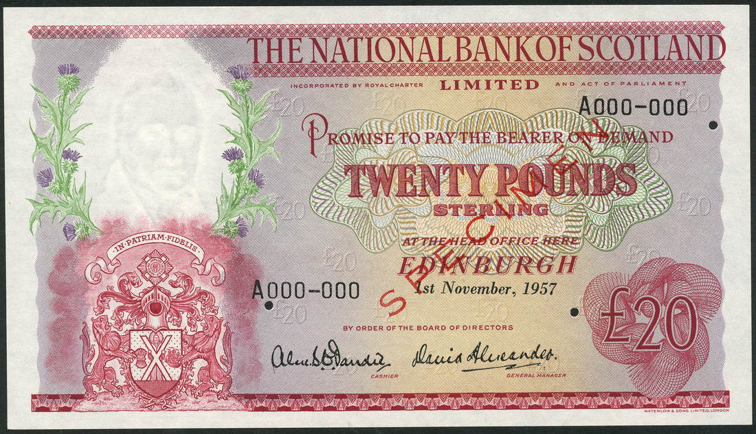 National Bank of Scotland Limited, specimen £20, 1 November 1957, serial number A000-000, red, lilac and green, arms of the bank low left, value in field, printed signature of A.Dandie and David Alexander, reverse red, the Forth rail bridge