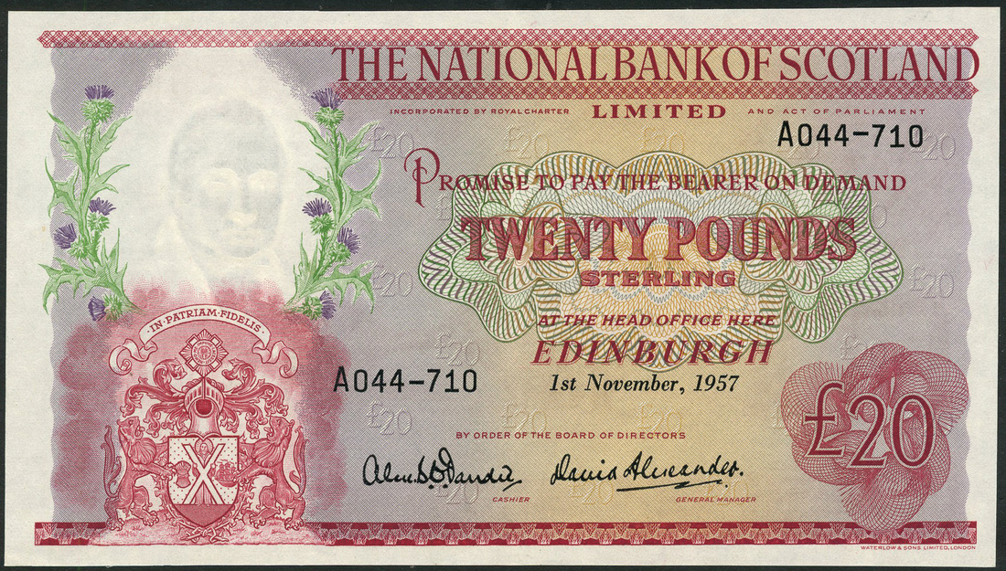(x) National Bank of Scotland Limited, £20, 1 November 1957, serial number A 044-710, red on multicolour underprint, bank coat of arms at low left with thistles above, value at centre and low right, bank title top centre right, Dandie/Alexander signature, reverse, Forth rail bridge