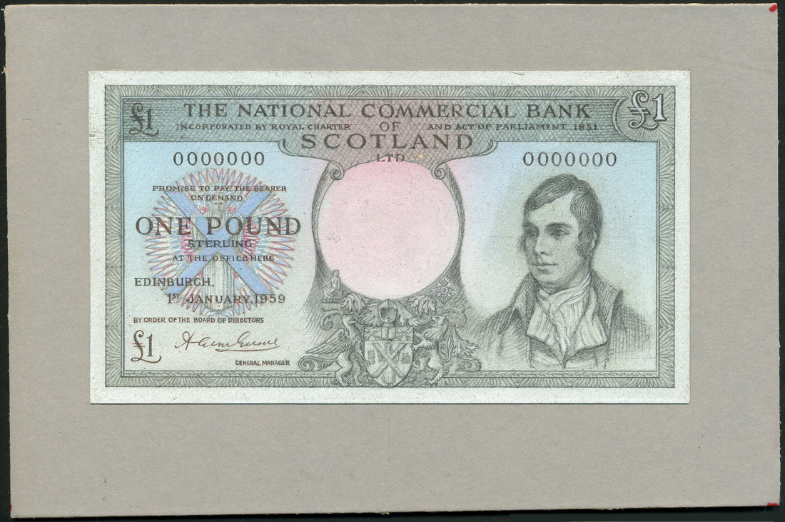 (†) National Commercial Bank of Scotland Limited, an obverse and reverse composite essay on board for a £1, Edinburgh, 1 January 1959, serial number 000000, grey-green, pale blue and multicoloured, portrait of Robert Burns at right, blue saltire over figure of Saint Andrew at left, reverse undulating landscape, value in ornate ovals at upper left and right