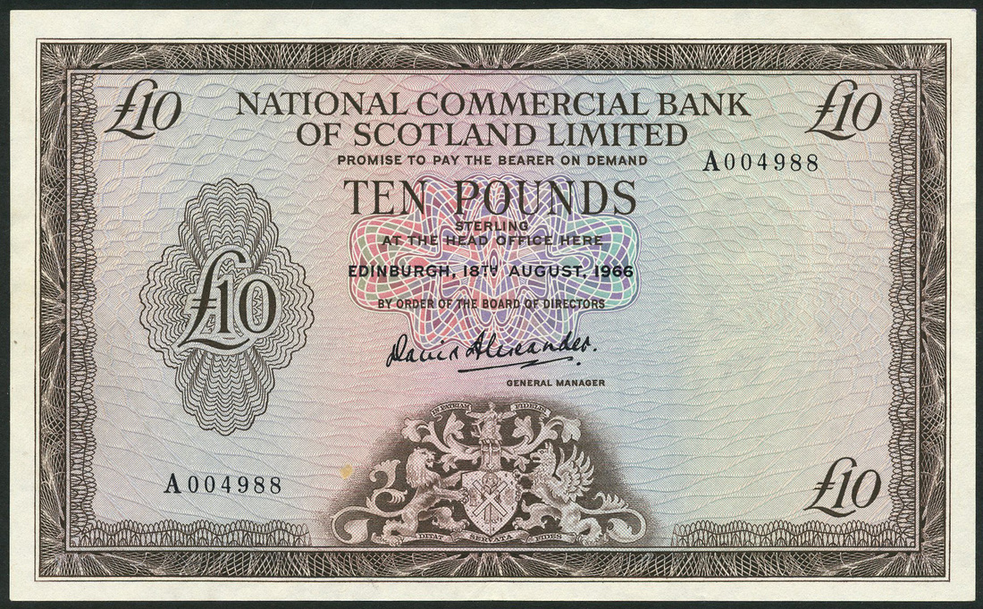 (x) National Commercial Bank of Scotland Limited, £10, 18 August 1966, serial number A004988, brown on multicolour underprint, bank arms at low centre, bank title top centre, ornate border, Alexander signature, reverse, Tay Road Bridge with Dundee in background