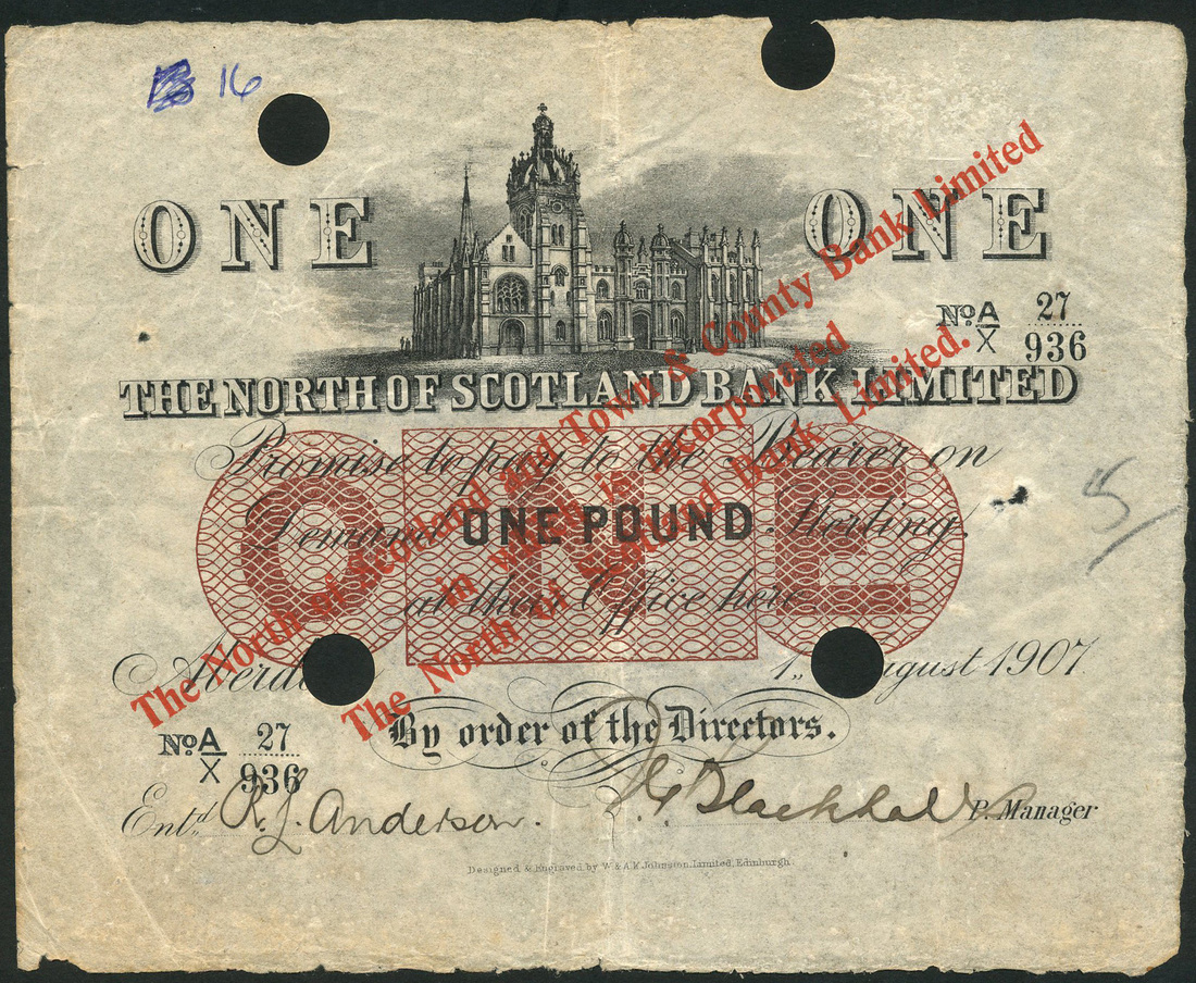 (x) North of Scotland Bank Limited, £1, 1 August 1907, serial number A/X 27 936, black and reddish brown, depiction of King's College, Aberdeen top centre with bank title below, value top left and right and at centre, Anderson/Blackhall manuscript signatures, reverse, bank arms in blue at centre