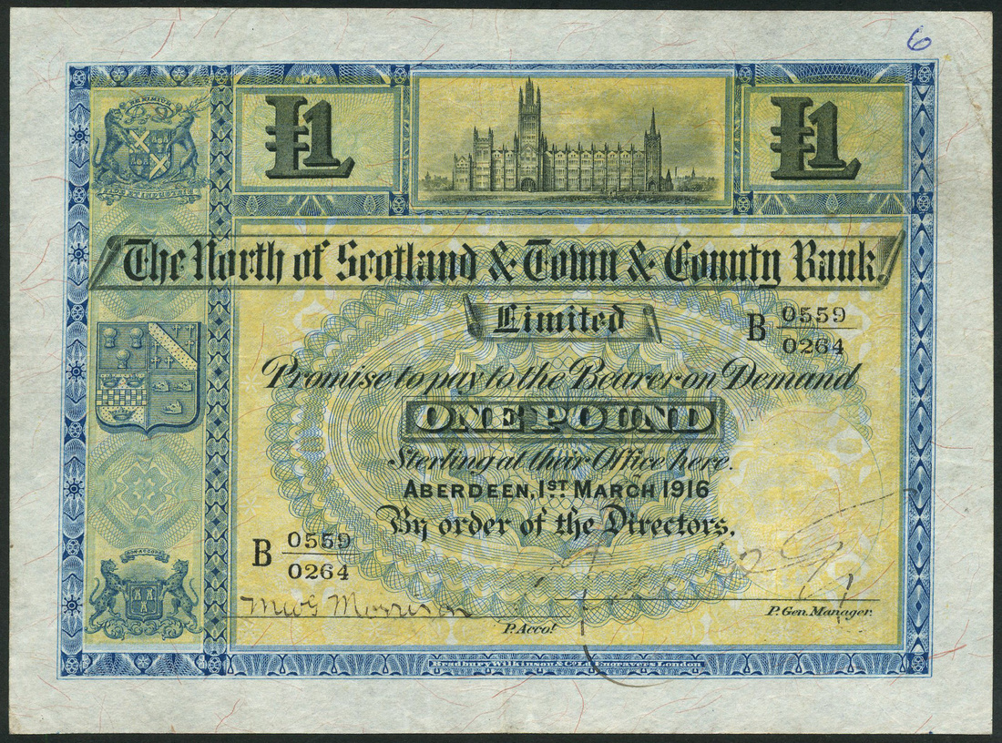 (x) North of Scotland & Town & Country Bank Limited £1, 1 March 1916, serial number B 0559/0264, blue on yellow underprint, Marischal College, Aberdeen at top centre flanked by value, three coats of arms in ornate panel at left, Morrison signature, reverse, bank arms centre left