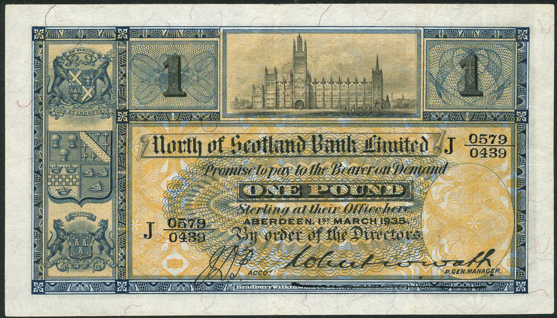 (x) North of Scotland Bank Limited, £1, 1 March 1935, serial number J 0579/0439, blue and yellow, Marischal College, Aberdeen top centre flanked by value, ornate panel at left with three coats of arms, bank title at centre, Robert Watt signature, reverse, bank arms at centre