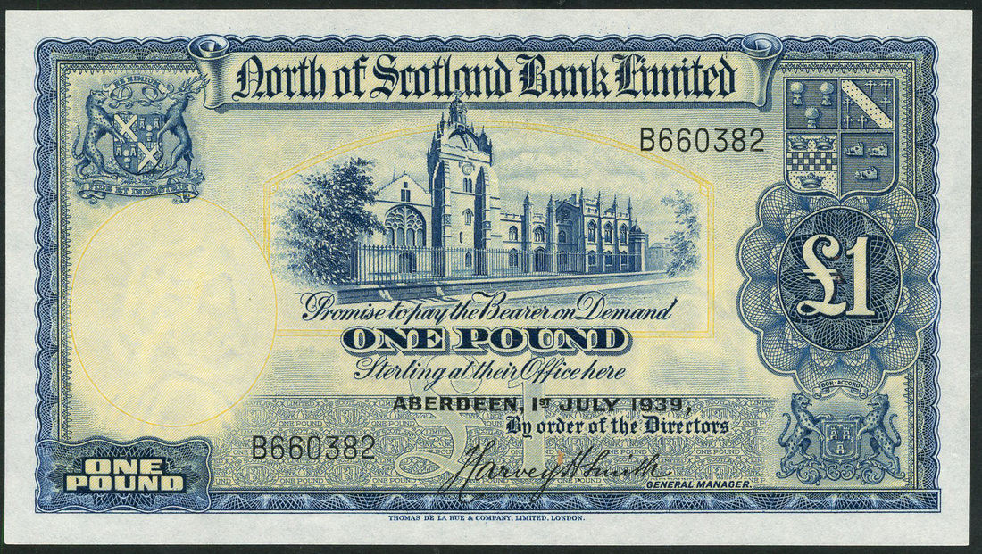 (x) North of Scotland Bank Limited, £1, 1 July 1939, serial number B660382, blue on light yellow, King's College, Aberdeen at centre, bank title top centre, coat of arms top left, ornate panel at right with two coats of arms and value, Harvey Smith signature, reverse, bank arms in elaborate panel at centre