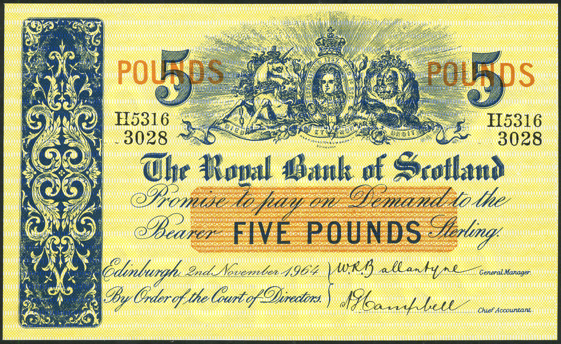 (x) Royal Bank of Scotland, £5, 2 November 1964, serial number H5316 3028, uniface, blue on yellow background, bank arms top centre, ornate panel at left, bank title at centre with value in reddish brown tablet below, Ballantyne/Campbell signature