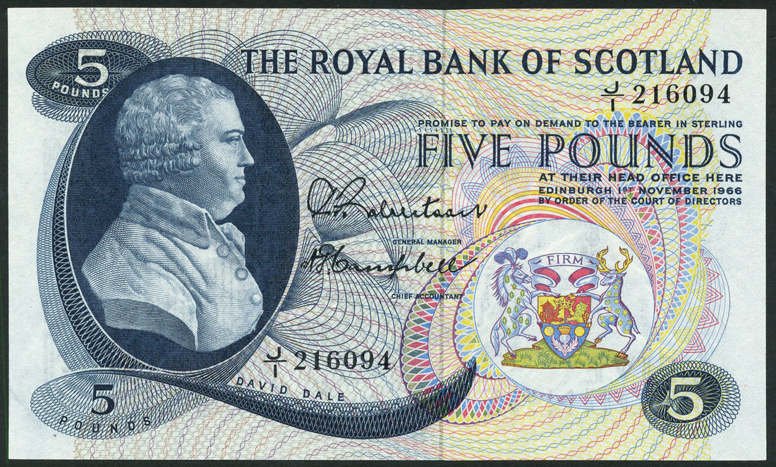 (x) Royal Bank of Scotland, £1, 1 September 1967, serial number A/17589557, £5 (2), 1 November 1966, serial numbers J/1 154621 and J/1 216094, green and blue respectively, Robertson signature (£1) and Robertson/Campbell (£5)