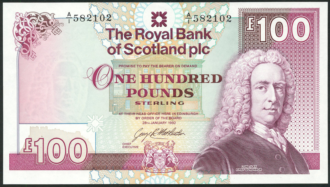 Royal Bank of Scotland plc, £100, 28 January 1992, serial number A/1 582102, maroon on multicolour underprint, portrait Lord Ilay at right, bank title top centre, bank headquarters in background at centre, arms low centre, reverse, Balmoral Castle
