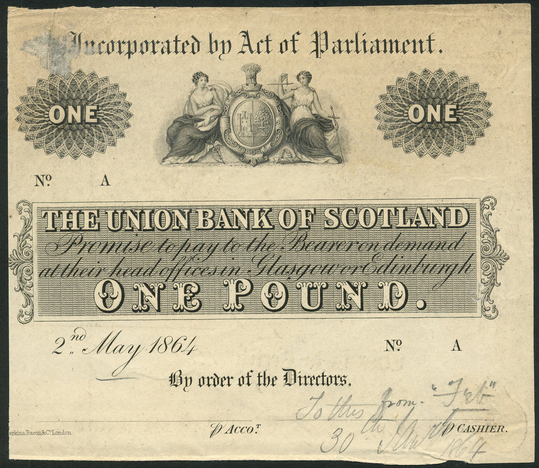 (x) Union Bank of Scotland, proof £1, 2 May 1864, black and white, arms top centre flanked by value