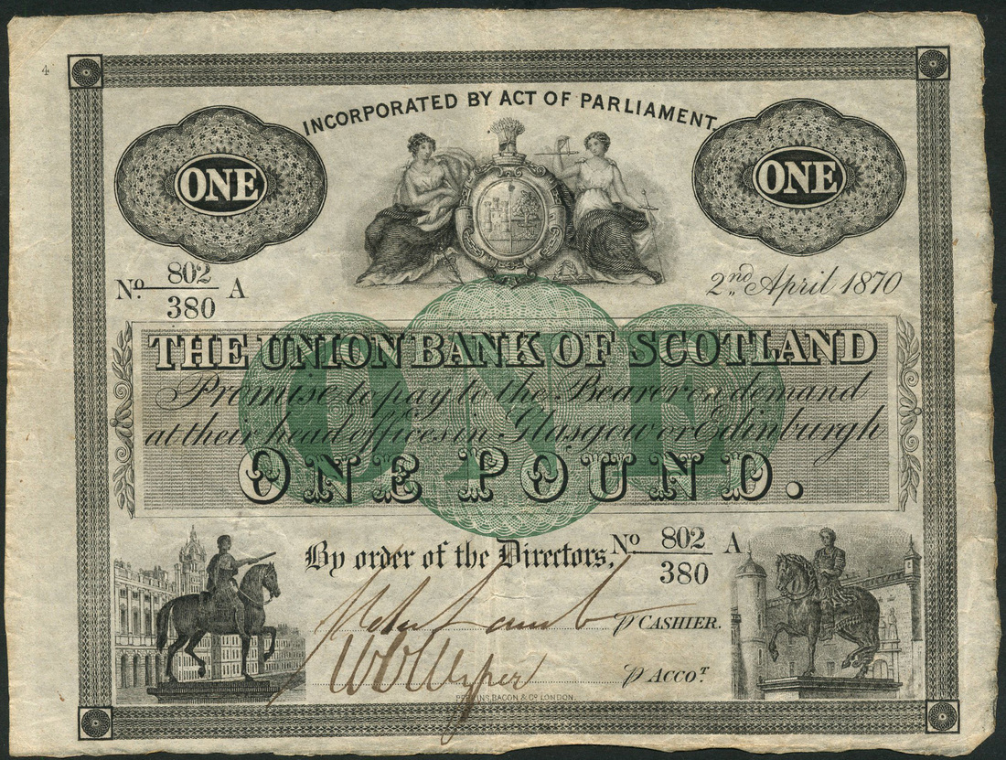 (x) Union Bank of Scotland, £1, 2 April 1870, serial number 802/380 A, uniface, blue, seated allegorical maidens flanked by value in ornate tablets at top centre, equestrian statues low left and right, bank title at centre panel with value in green, Lamb/Wyler signature, reverse, bank title and value in blue guilloche pattern