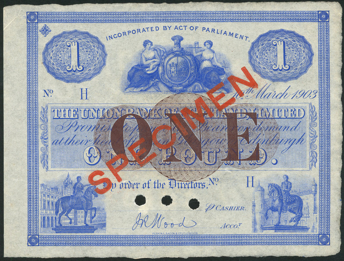 (x) Union Bank of Scotland Limited, specimen £1 (3), 1893 (2), 1903, uniface, blue and white, seated allegorical maidens top centre, equestrian statues low left and right, bank title with value in brown in tablet at centre,