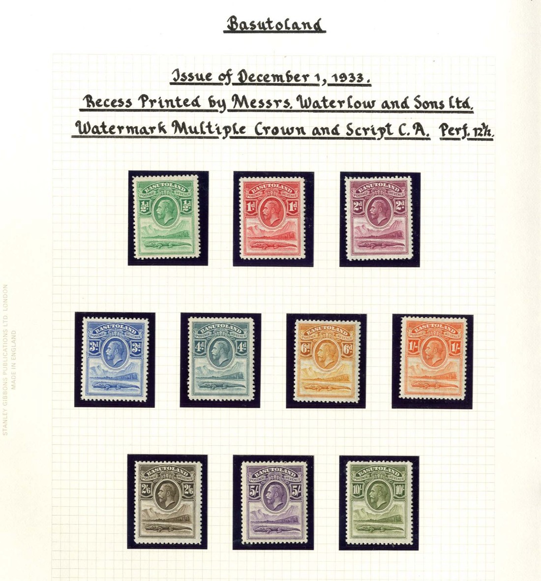 A collection neatly mounted and written-up on pages, including Cape ½d. block of four and a selection of South Africa values (some on pieces) and three stationery cards used in Basutoland; 1933 set mint and £1 Revenue used, 1935 envelope with Imperial Press Conference cancellation 1938 set mint with additional 1d. showing "Tower" flaw, 1942 Revenue Native Tax 10/- on 2/6d. (both languages) used, 1954 set mint, 1961 Surcharges with all types and 1961-63 sets (to 1r. Revenue) mint, Postage Dues with 1933 pair perforated "specimen", 1d. scarlet, 1d. St. Edwards Crown error contained in a corner block of six, and a selection of postal stationery; generally fine with the majority of the mint unmounted