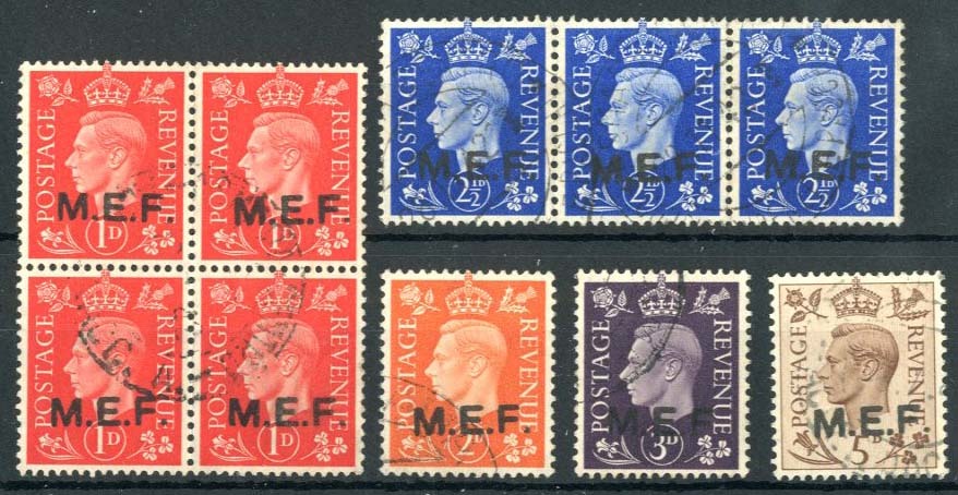 1942 (Mar.) overprint 13½mm. long with round stops, 1d. block of four, 2d., 3d., 5d. singles and 2½d. strip of three, fine used. S.G. M6a-M10a, £400+