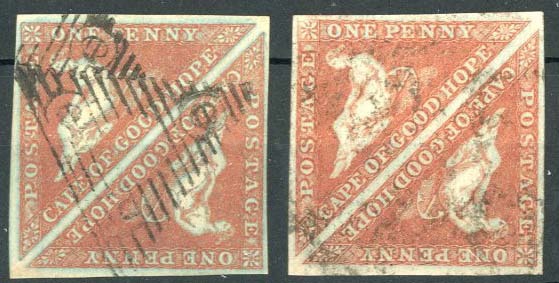 1d. brick-red pair with good to large margins and sharp outline to blueing, and a further pair with good to large margins and just a trace of blueing. An attractive pair