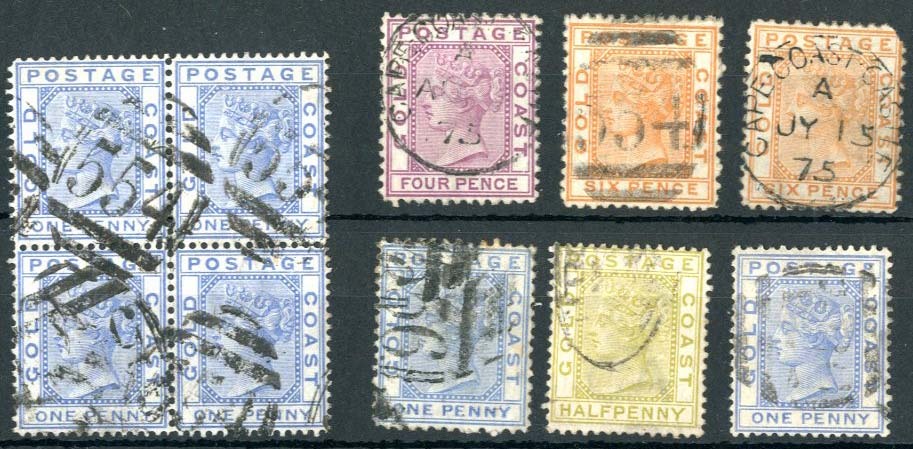 1875 CC, perf 12½ 1d., 4d. and 6d. (2, one with top right corner clipped but with earliest known postmark on 6d. value), 1876-84 perf 14 1d. block of four and 1883 ½d. and 1d., all used, generally fine. Cat. £576