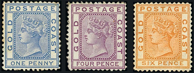 1875 CC, perf 12½ 1d. blue, 4d. magenta and 6d. orange, all unused, the first two with small part original gum, the last without gum, all with small faults. S.G. 1-3, £1650. Photo