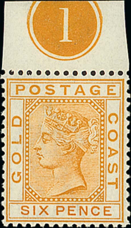 6d. yellow with plate number at top, mounted in the selvedge only, fine. A very scarce shade. S.G. 17 var. Photo