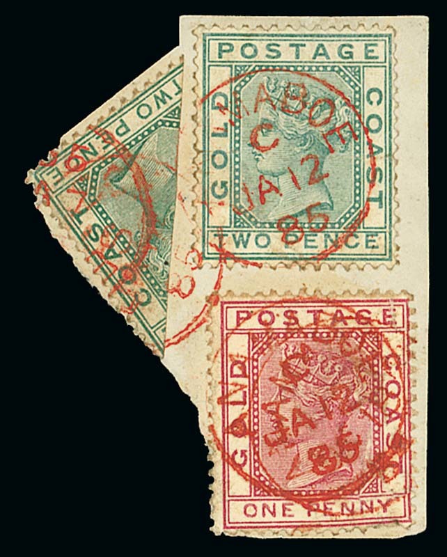 2d. green bisected diagonally on piece with 1d. carmine and 2d. to make 4d. rate, all clearly cancelled by "anamaboe" c.d.s. in red (12.1.85), fine and rare. Photo