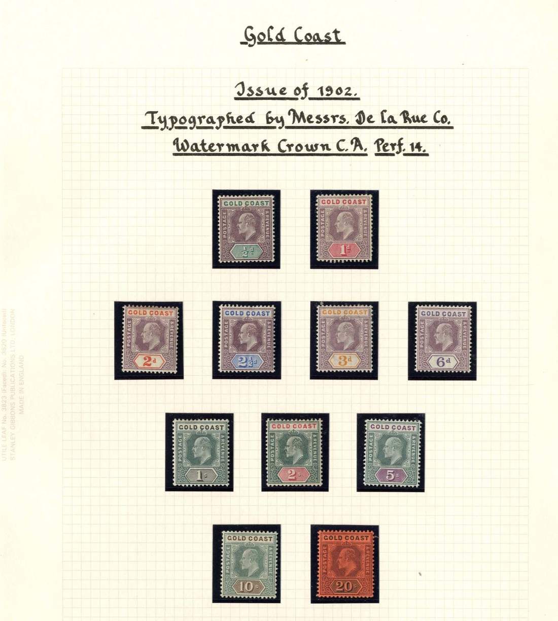 1902 CA ½d. to 20/- set of eleven, 1904-06 MCA ½d. to 2/6d. set of seven, 1907-13 MCA ½d. to 5/- set of ten with ½d. and 6d. shades, 2d. with break in frame of value tablet, 3d. with break in frame of country tablet and 2/- on chalky paper, and 1908 1d., mostly fine mint. S.G. 38-70, £830