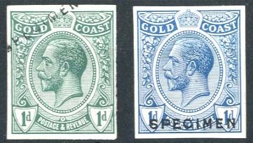 c.1922 printer's sample proofs, imperforate 1d. in green and in blue on unwatermarked and ungummed paper, both overprinted "specimen" (Types DS2 and DS1 respectively), fine