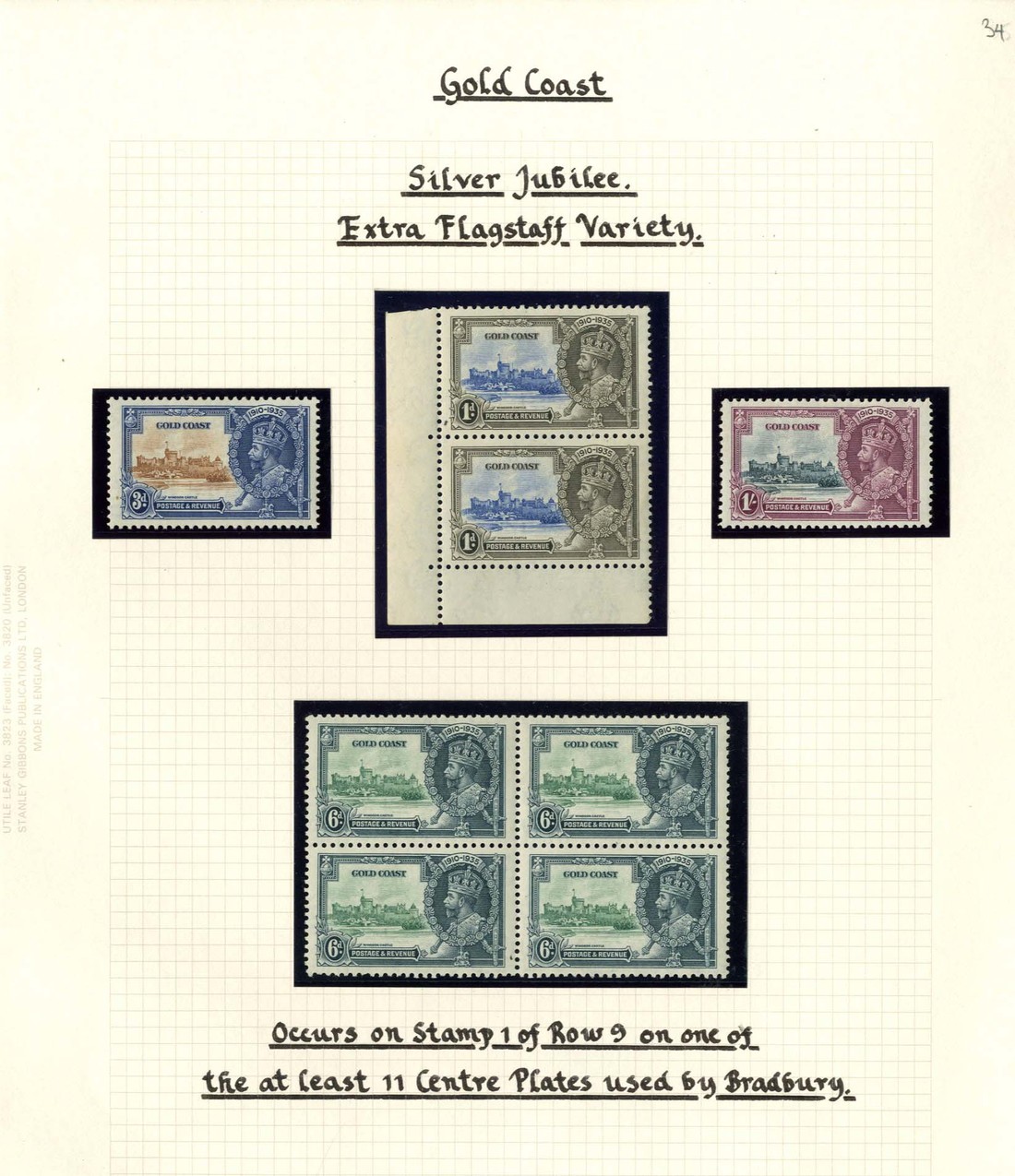 1935 Silver Jubilee 1d. lower left corner vertical pair, 3d. and 1/- singles and 2½d. block of four, each showing variety extra flagstaff, fine mint. S.G. 113a-116a, £715