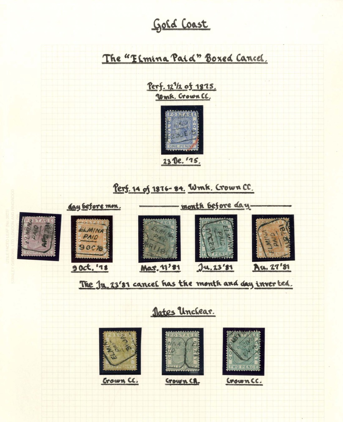 A small range of Elmina cancellations on loose adhesives with values to 6d. comprising boxed d.s. (12 items, three without date), single-ring d.s. (9 items, three in red and one in blue) and an intaglio seal; good to fine