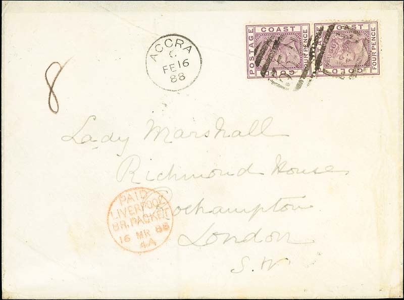 1888 (16 Feb.) envelope to London, bearing 1885 4d. deep mauve vertical pair affixed sideways and tied by "554" numeral, showing manuscript "8", Accra c.d.s. and "paid/liverpool/br. packet" c.d.s. in red (16.3) with arrival datestamp on reverse. Photo