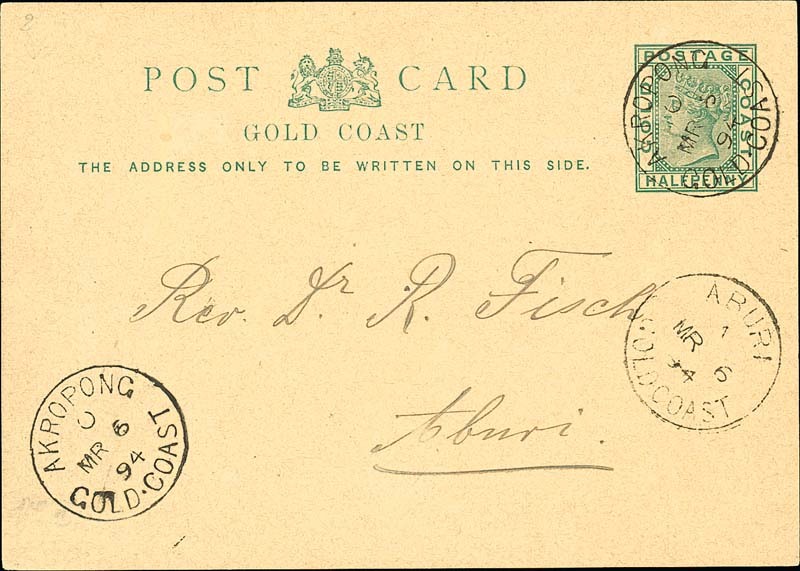 1894 (6 Mar.) ½d. stationery card to Aburi, cancelled by superb "akropong/gold coast" c.d.s. with another strike in opposite corner and with arrival c.d.s. (6.3) below stamp impression; fine and attractive. Photo