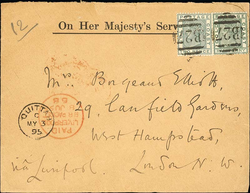 1895 (3 May) OHMS envelope to London, bearing 1884-91 ½d. green and 2d. grey tied by fine "B27" obliterators, showing "quittah" despatch c.d.s. partly overstruck by re "paid/liverpool/br. packet" c.d.s. (8.6) with arrival datestamp on reverse. A neat and attractive franking. Photo