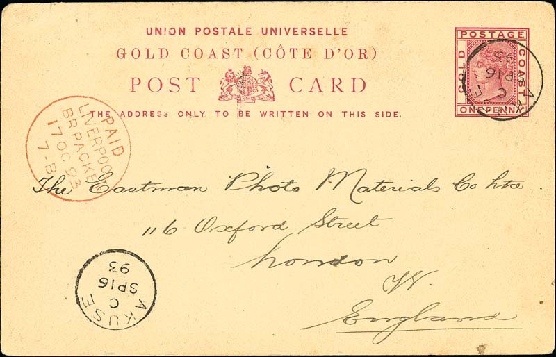 1895 (16 Sept.) 1d. stationery card to London, cancelled by fine "akuse" c.d.s., showing another strike in opposite corner with red "paid/liverpool/br. packet" c.d.s. (17.10) alongside; the message requesting a price list of Kodak photographic chemicals. Photo