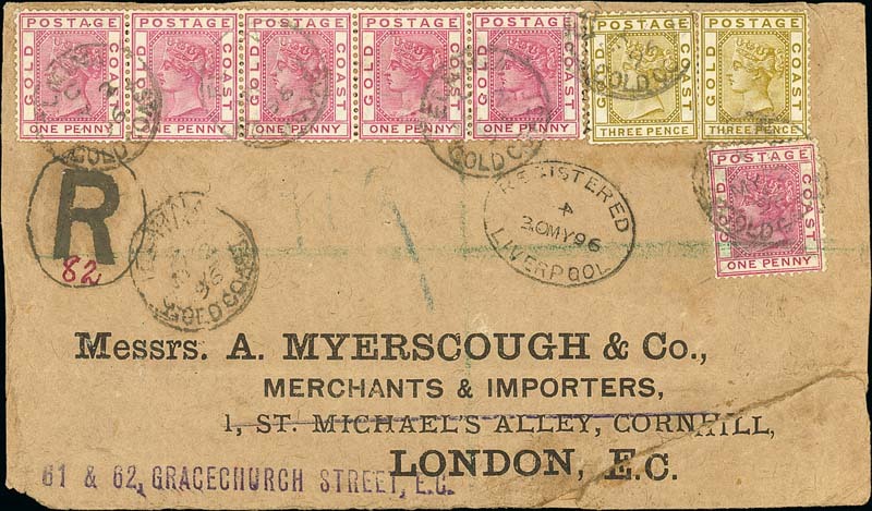 1896 (2 May) "Myerscough" quadruple rate envelope registered to London, bearing 1884-91 1d. rose-carmine strip of five and a single, and 3d. olive (2), all cancelled with legible "axim/gold coast" c.d.s., showing "R" in oval, Liverpool Registered oval d.s. (30.5) with faint Cape Coast c.d.s. (3.5) on reverse; the envelope with repaired tear across lower right corner, nevertheless an attractive 2oz. franking. Photo