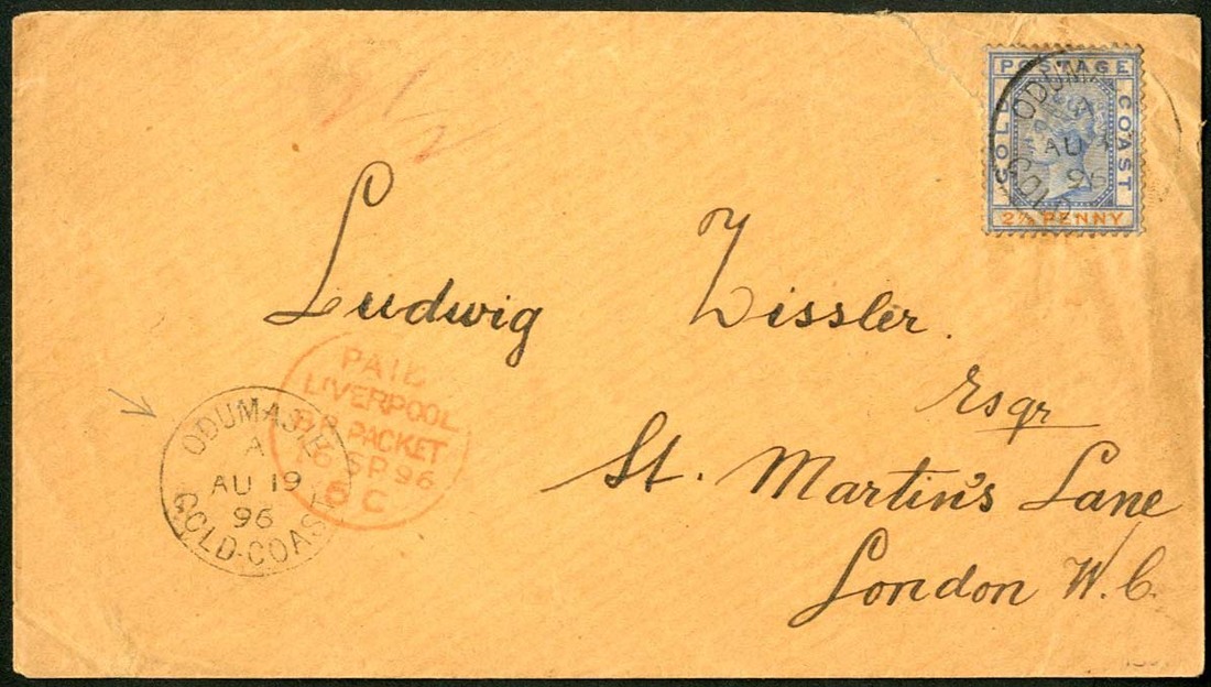 1896 (19 Aug.) envelope to London, bearing 1891 2½d. tied by "odumasie/gold coast" c.d.s. and showing another strike in opposite corner partly overstruck by red "paid/liverpool/br. packet" c.d.s. (16.9); the adhesive with some stained perforations