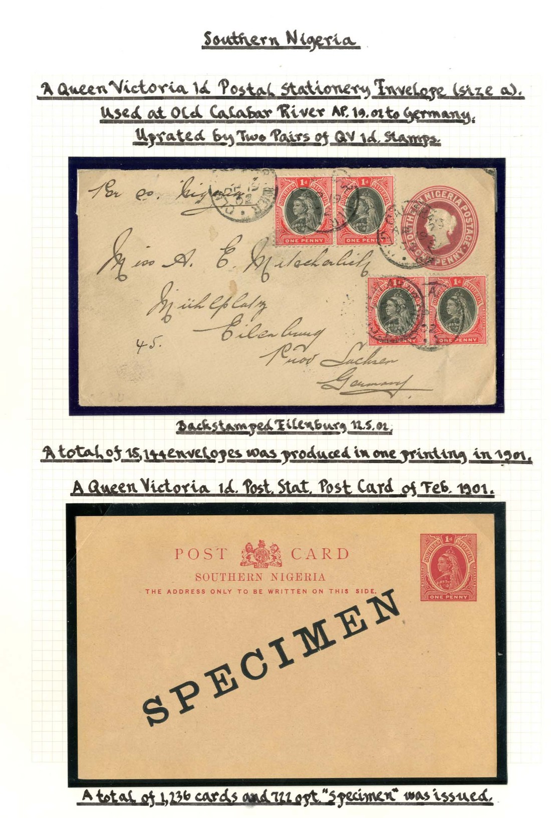 A small range comprising Cards with 1900 1d. and 1903 1d. reply paid both overprinted "specimen" and 1d. used (registered from Sapele to Germany and uprated with 6d. - faults), and 1908 ½d. on 1d. unused and used; Envelopes with 1901 1d. sizes a and b used (the former to Germany and uprated 4d.); Registered Envelope 1902 size G to Liverpool uprated with 1d. Generally fine