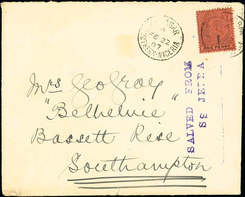 1907 (22 Feb.) envelope to Southampton, bearing 1904 1d. tied by "calabar/southern nigeria" c.d.s. with another strike alongside and showing fine "salved from/ss jebba" h.s. in violet with arrival datestamp (20.3) on reverse. Photo