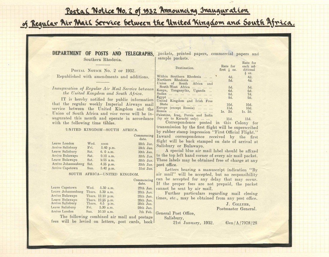 A selection of envelopes (9) and cards (2) addressed to UK each franked at 10d., from Bulawayo (4, one posted from Figtree, and one from Victoria Falls), Salisbury (4, one posted from Blanket Junction and three on special souvenir envelope), Broken Hill (2) and Mpika, each with "first official air mail" h.s. in violet or black. A good lot