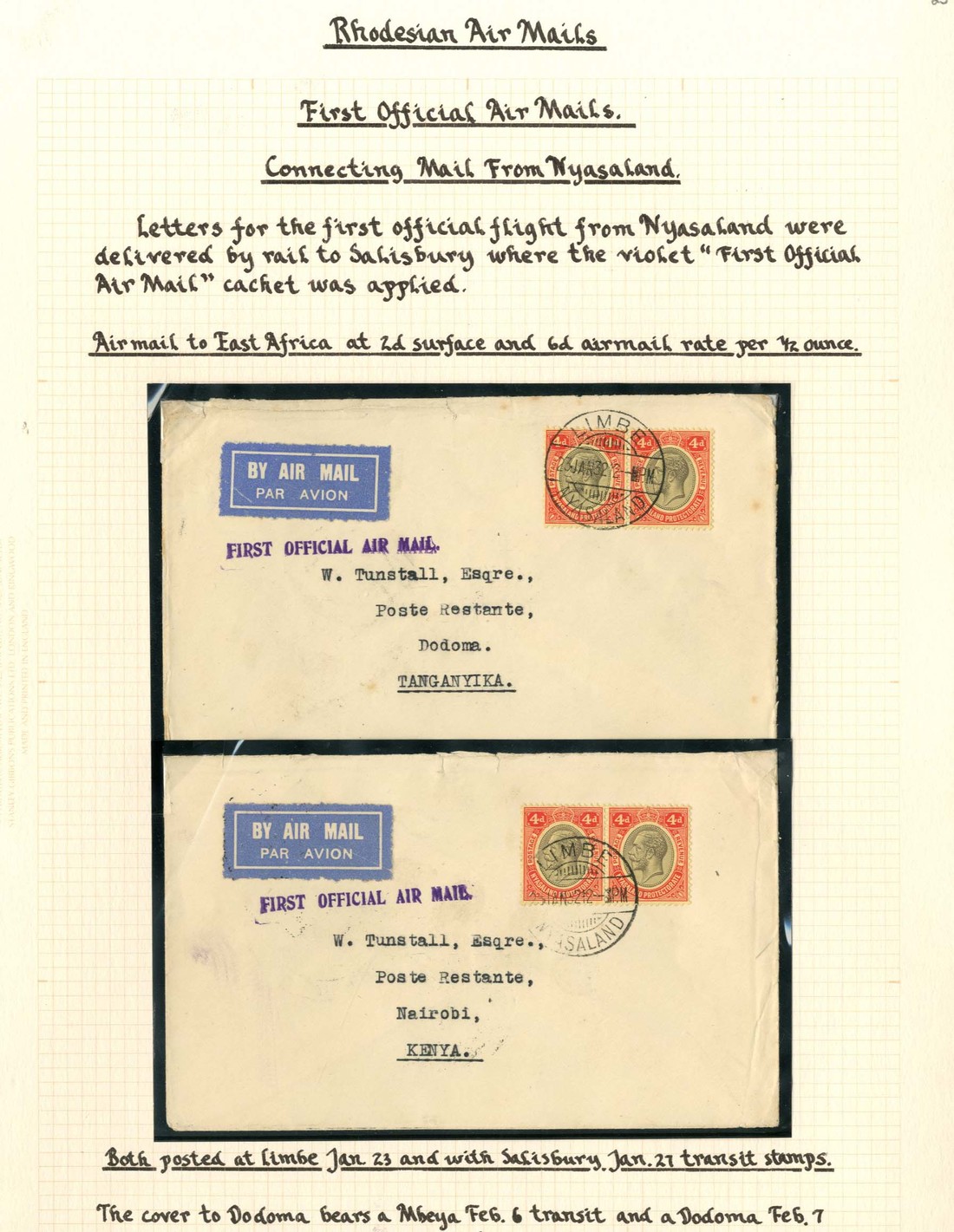 A selection of envelopes (8) from Nyasaland connecting with the Imperial Airways flight addressed to Dodoma, Nairobi and UK (6), with frankings of 8d. (2), 1/- (4) and 1/1d. (underpaid and bearing GB Postage Due 2d.), each showing "first official air mail" h.s. in violet