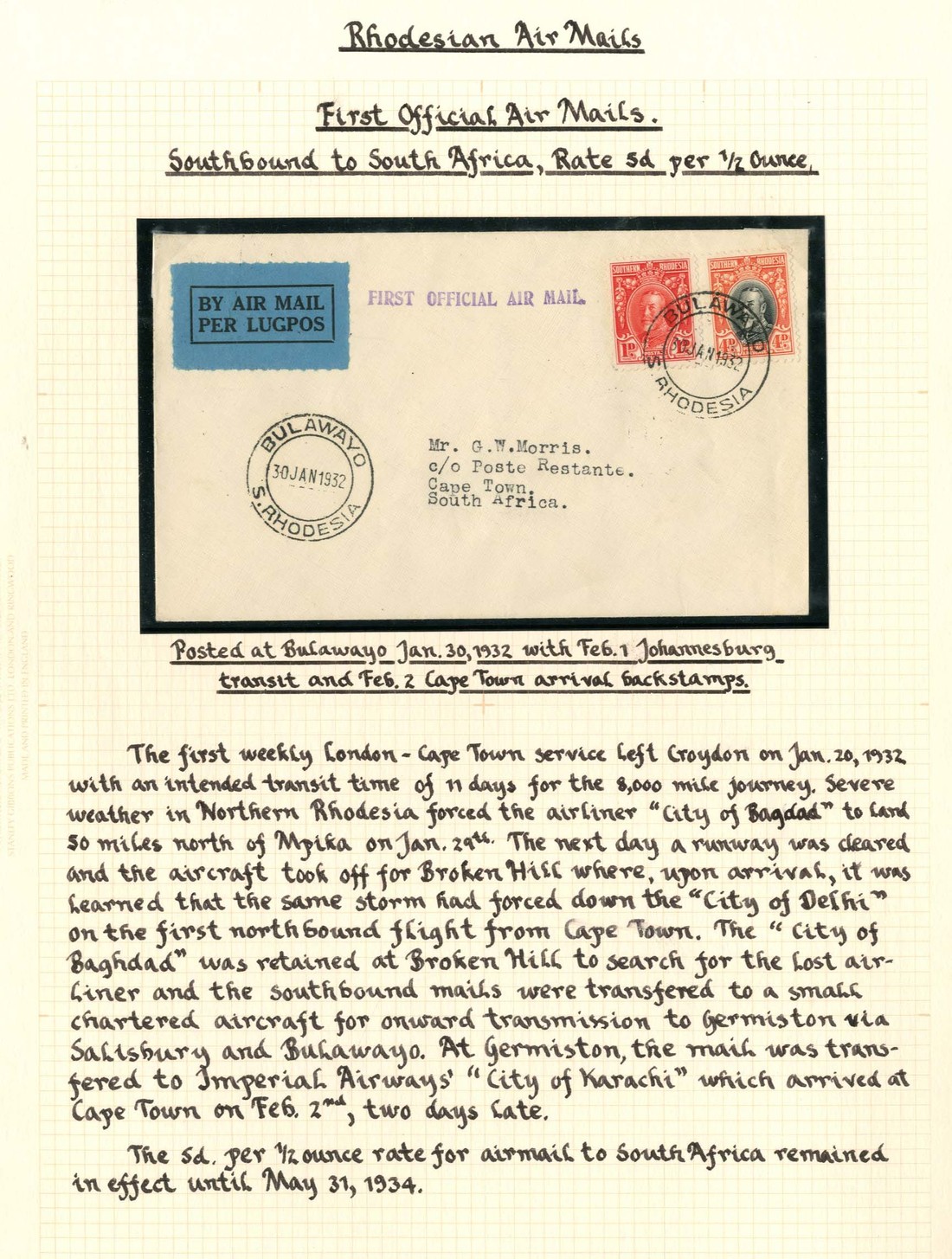 Envelopes (7, one registered) from Mpika to Cape Town (2, one signed by pilots), Broken Hill to Cape Town (signed by pilots), Salisbury to Bulawayo (addressed to India - small faults) and from Bulawayo to Cape Town and Windhoek. A good lot