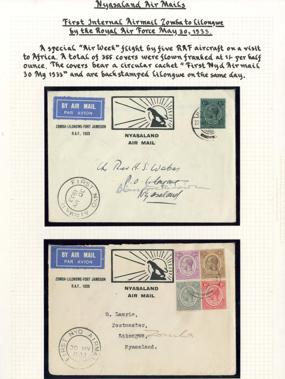 1933 (30 May) special envelopes (2) flown by R.A.F. from Zomba to Lilongwe and from Blantyre to Lilongwe, both franked at 1/- and showing "first nyd airmail" double-ring d.s.; 1933 (31 May) envelope from Blantyre to Scotland, franked at 1/2d. and marked "Special Air Mail from Nyasaland per 'City of Karachi'"; and 1933 (5 June) envelope carried on return of special R.A.F. flight from Blantyre to Fort Jameson, franked at 1/- (light foxing around perfs) and showing "nyd nrhod airmail" double-ring d.s.