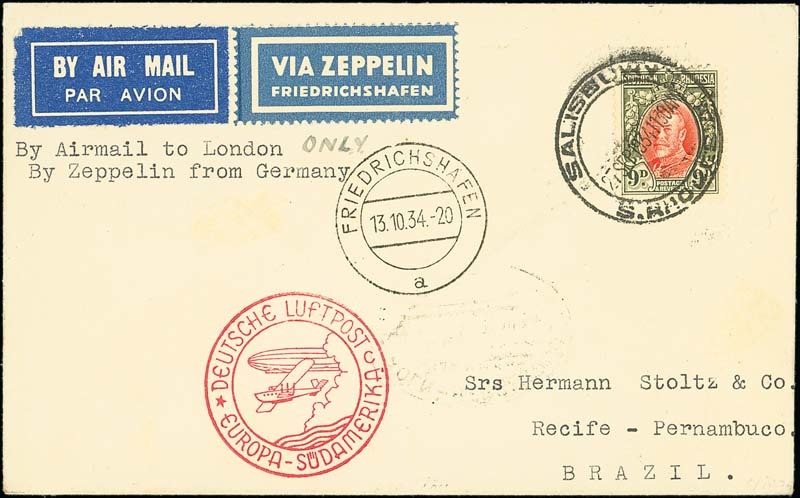 (13 Oct.) envelope from Salisbury to Pernambuco, Brazil, marked "By Airmail to London only, By Zeppelin from Germany", franked at 8d. for the Eleventh South America Flight, showing various transit and arrival datestamps. Rare. Photo