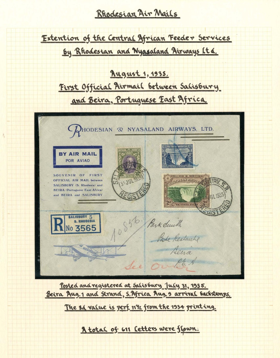 Envelopes (5, four the special printed type) from Salisbury (2, one bearing 1943 perf 11½ 8d.), Lusaka and Blantyre (2, one signed by pilot), fine