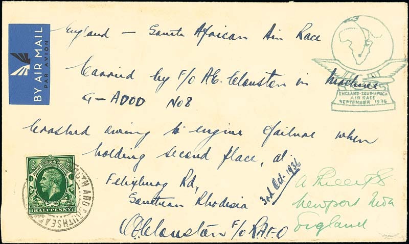 Envelope carried by A.E. Coulston, posted originally at Portsmouth (28.9) with GB ½d. and addressed back to UK, envelope bears full endorsement re accident and signature of Coulston, air race cachet front and back. Photo