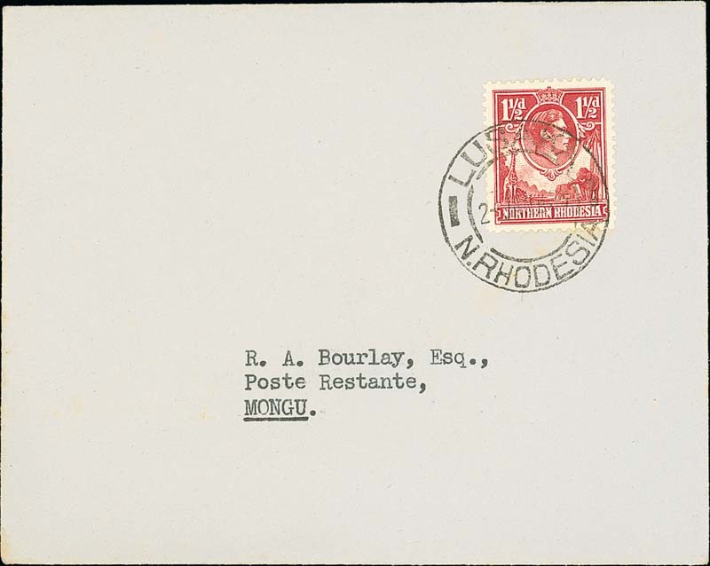 (2 Jan.) from Lusaka to Mongu, franked at 1½d. and showing Mongu-Lealui arrival datestamp (9.1) on reverse. Photo