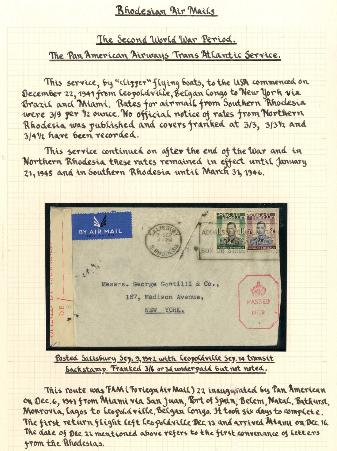 1942-44 envelopes (5) flown on Pan-American Airways Trans-Atlantic Service to USA from Bulawayo, Salisbury, Ndola, Luanshya and Lusaka, showing frankings of 3/6d. (underpaid 3d.), 3/3½d., 4/1d. (registered), 3/4½d. and 4/2d., all with censor cachets and/or labels. A good group