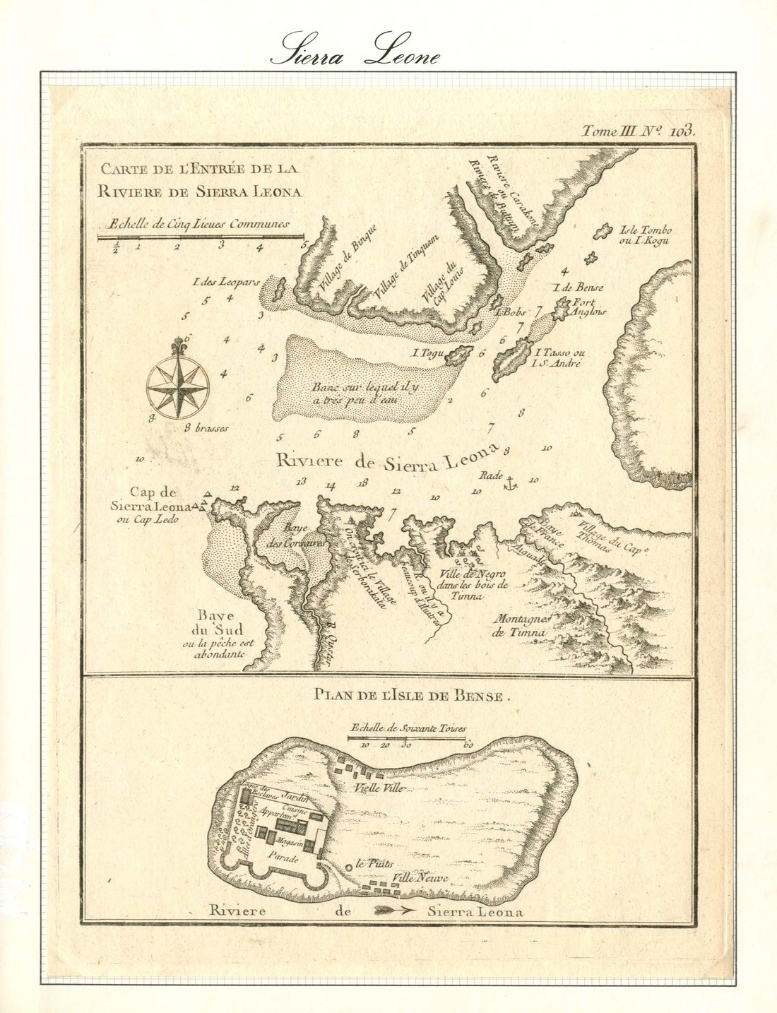 French map titled "Carte de L'entrée de la Riviere de Sierra Leone" and "Plan de L'Isle de Bense"; clean and in fine condition