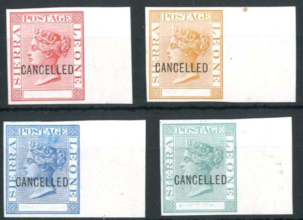 1d. rose-red, 3d. buff, 4d. blue and 1/- green, each with margin at right, all without value on glazed unwatermarked paper, the odd minor mark otherwise fine and most attractive