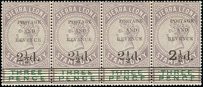 2½d. on 3d. dull purple and green, a strip of four showing Types 10, 11, 12 and 8, fine mint. S.G. 55-58, £681. Photo