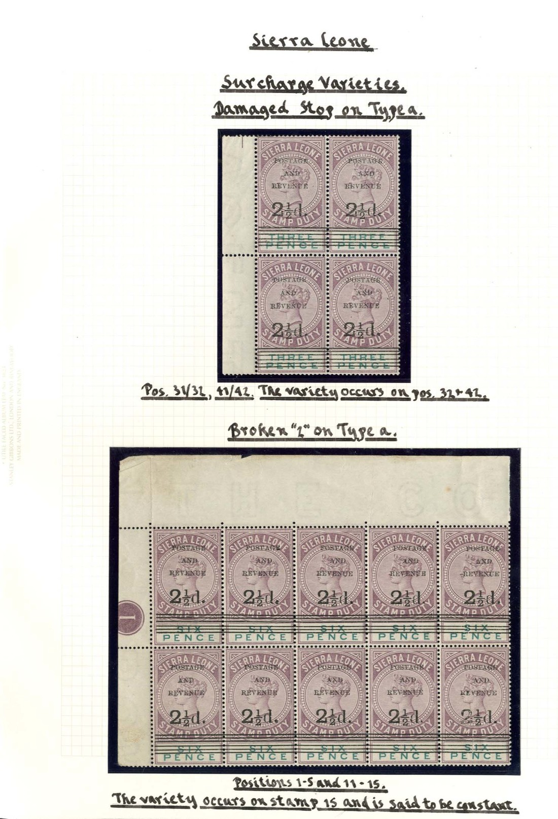 2½d. on 3d. dull purple and green, a top left plate number corner of ten (5x2) with Type 8 showing damaged stop, and a block of four with margin at left, [31-32/41-42] with the lower pair showing same variety, also a single with Type 8 showing surcharge transposed due to downward shift, fine mint. S.G. 55, £165+